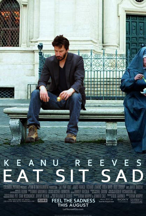 Whether or not they left an imprint, the hunky actor has been seen looking sad quite a bit lately. The recent pictures of Keanu on his birthday, shown wandering the streets of New York City looking lost and disheveled, and stopping for a solitary snack of a cupcake, made therounds of the Internet. Since Reeves is one of the genuinely best liked of Hollywood actors, the actor's apparent angst made his many fans uncomfortable. As often happened they responded to the discomfort with black humour. By black humour I mean that a whole bunch of "Sad Kenau" photmanips began showing up on message boards. Here are a few such photomanips that popped up on the Internet's premier celebrity gossip message board Gossiprocks: